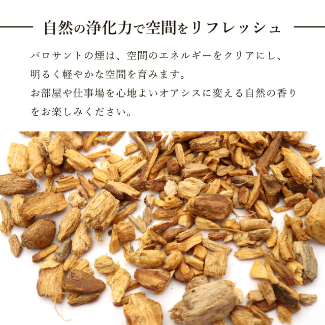 濃厚な香りで空間を浄化する力があり、かつてはラテンアメリカの先住民たちが魔除けとして使用し、 昨今ではニューヨーク周辺のファッション業界やヨガインストラクターなどから注目を集め、日本でも幸福を呼び込む香木として話題のアイテムです。